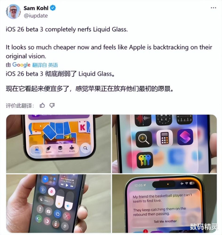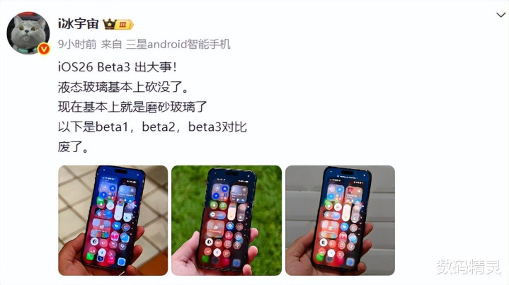 网上总是有人说,苹果在某些事情上的而做法和微软有点像,总是喜欢在某个系统初始版本加入一些新功能,后续过不了多久又逐渐砍没了,对用户来说,总有一种被戏耍的感觉,iOS26就出现了这种情况,就在今天,苹果正式推出了iOS 26第三个开发者测试版,最大变化居然是将液态玻璃风格给砍废了,据已经测试过的用户反映,自己在升级到iOS 26 beta 3之后,液态玻璃质感再次被严重削弱,首个版本那种通透的玻璃质感已经几乎看不到了。